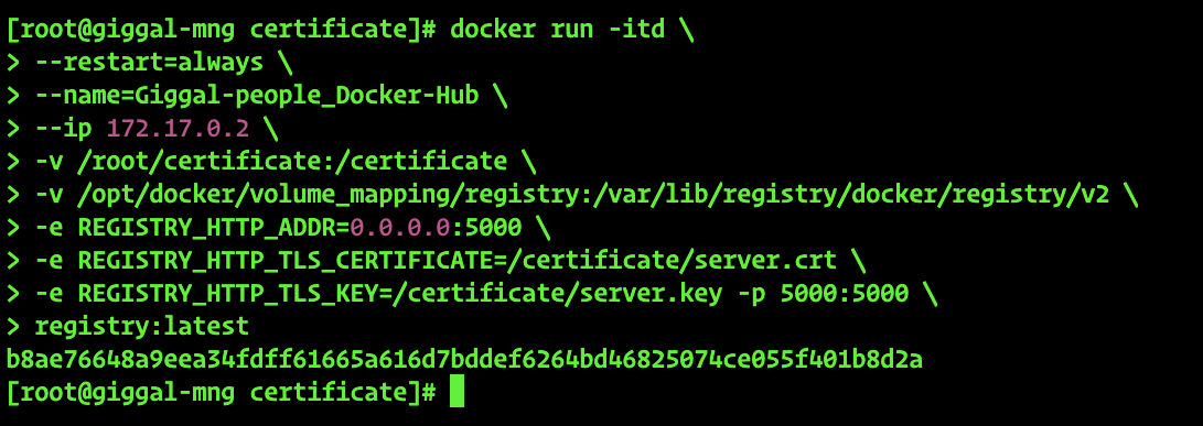 -e REGISTRY_HTTP_TLS_KEY={Container ๋ด๋ถ ์ธ์ฆ์ ๋ณด๊ดํ Directory}/server.key -p 5000:5000 \