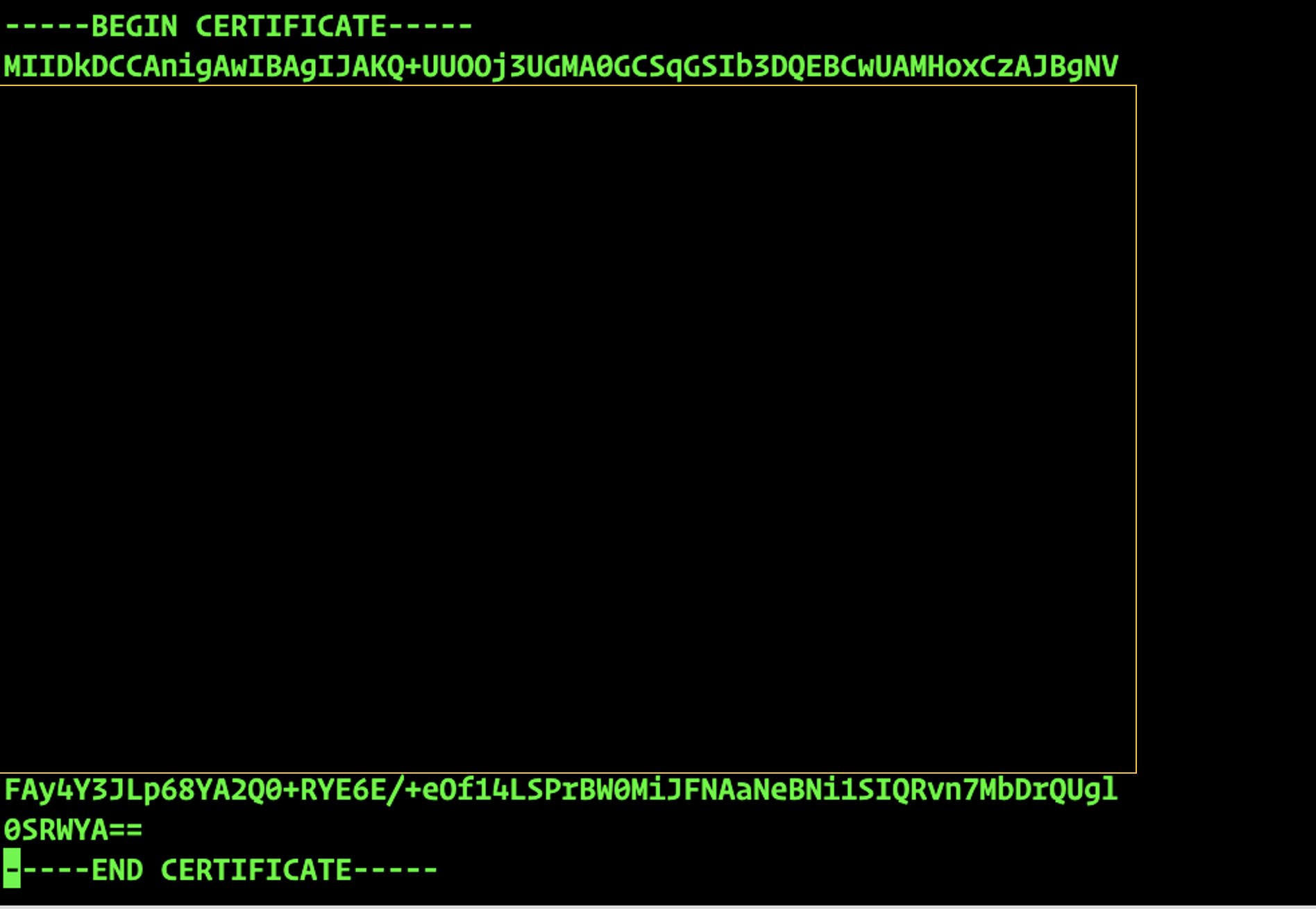 pem File์ ์์ ํด์ผ ํ๋๋ฐ, ์์ ๊ฐ์ด ---BEGINS CERTIFICATE--- ๋ถํฐ ---END CERTIFICATE---- ๊น์ง๋ง ๋จ๊ธฐ๊ณ ๋ชจ๋ ์ง์์ฃผ์ธ์. ๋ง์ฝ ์ด ๋ด์ฉ์ด ๋ ๊ฐ๋ผ๋ฉด ๋งจ ์๋ ๋ถ๋ถ๋ง ๋จ๊ธฐ๊ณ , ๋ชจ๋ ์ง์์ค๋๋ค.