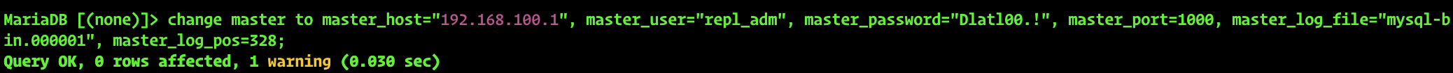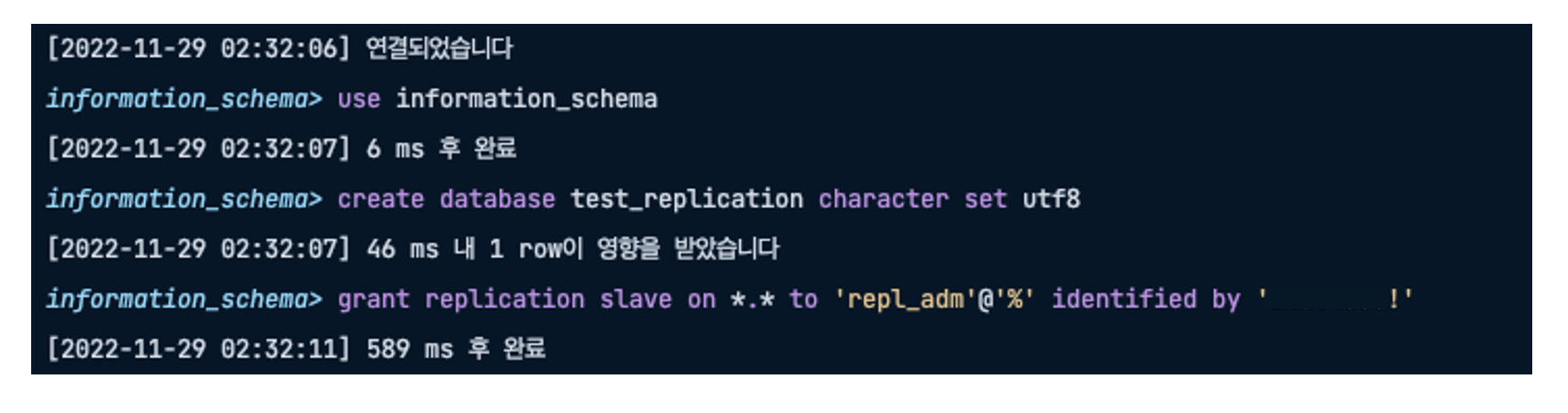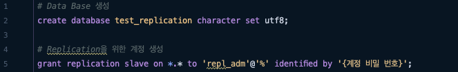 grant replication slave on *.* to 'repl_adm'@'%' identified by '{๊ณ์ ๋น๋ฐ ๋ฒํธ}';