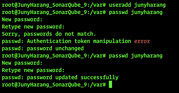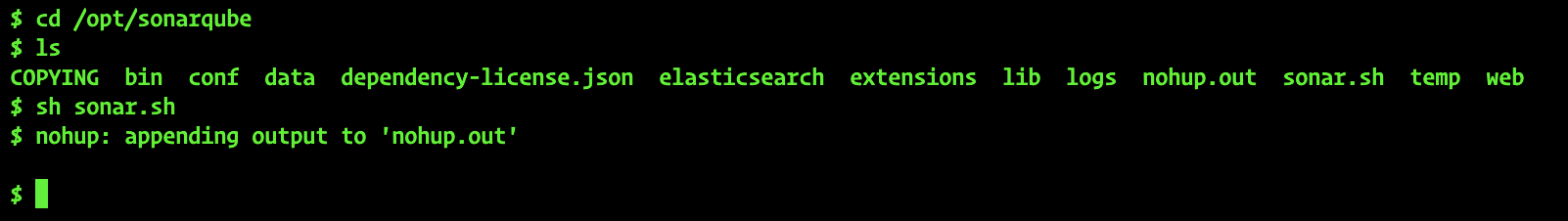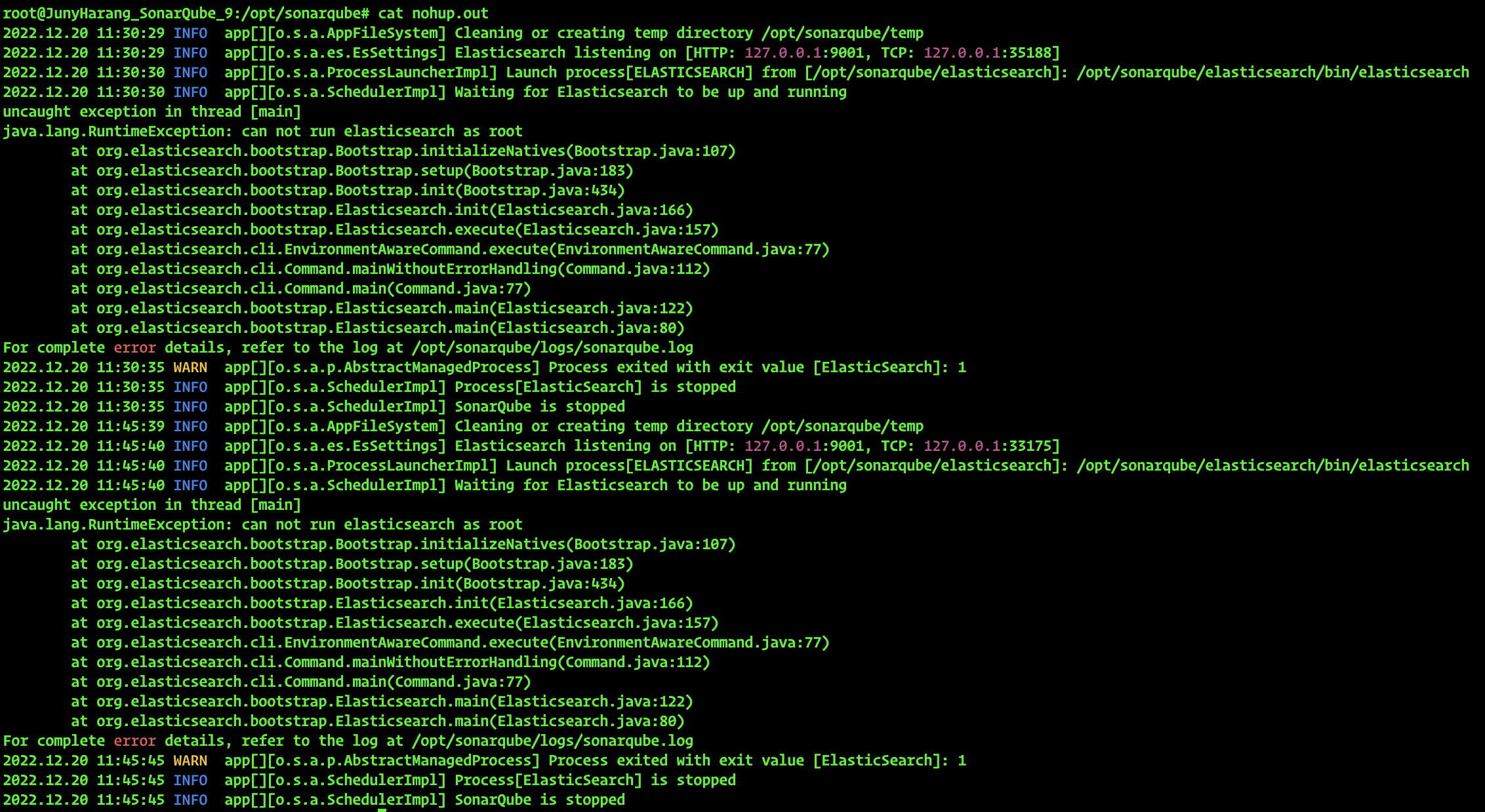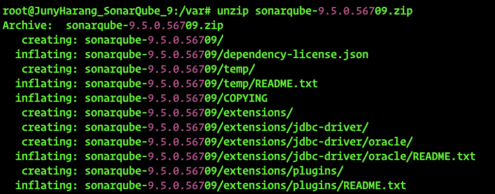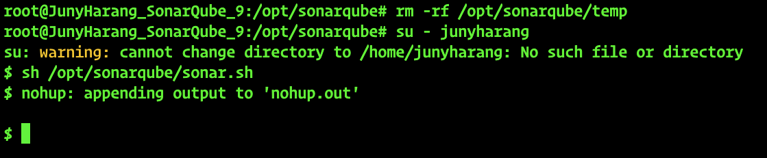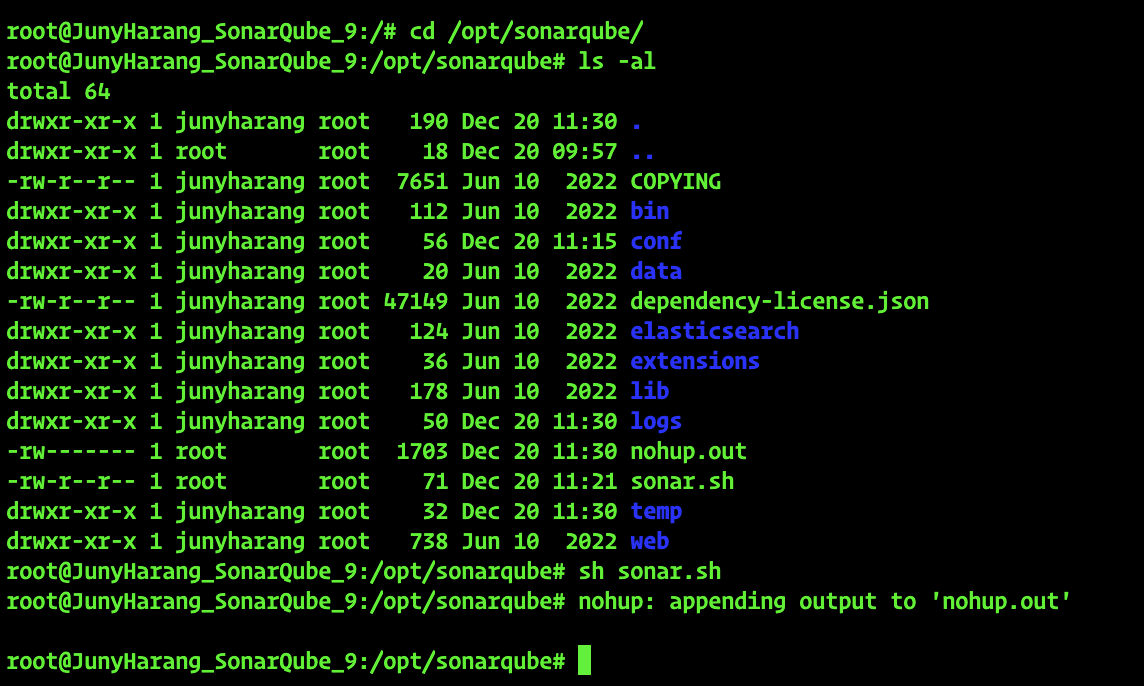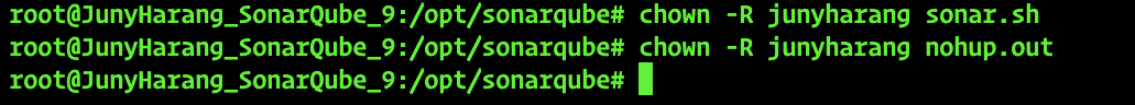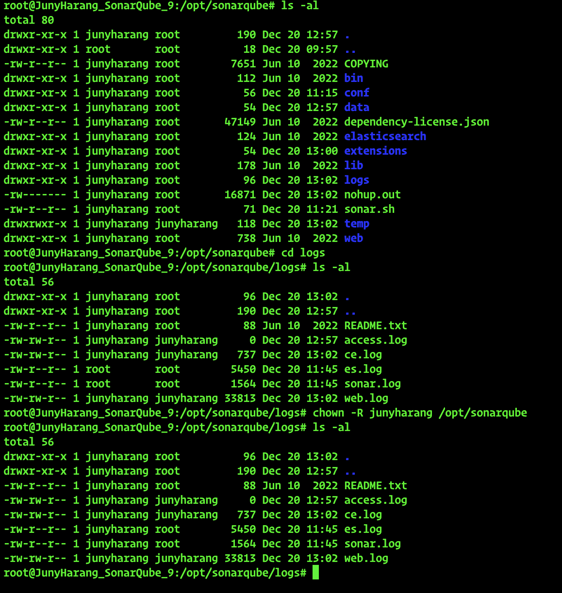๊ทธ๋์ /opt/sonarqube Directory ๋ฐ์ ๋ชจ๋ ์์ ๊ถ์ junyharang ๊ณ์ ์๊ฒ ์ฃผ์์ด์.