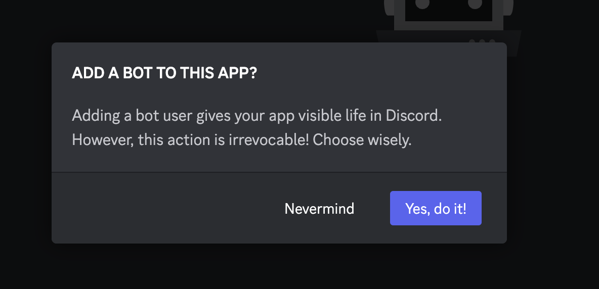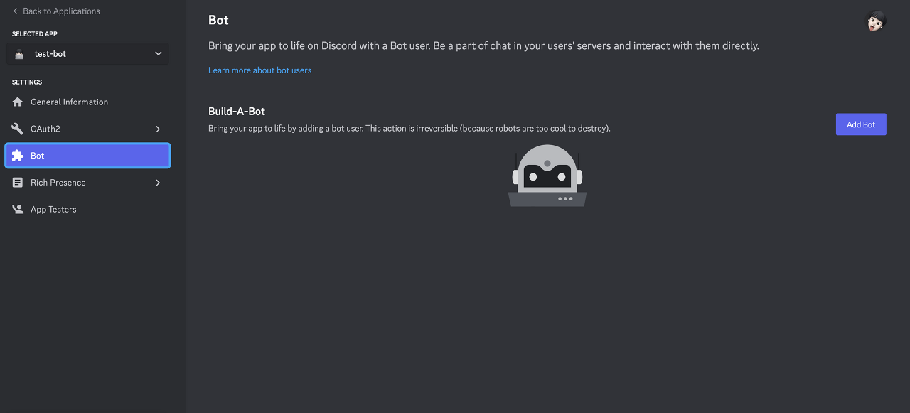 Bot Tab์ผ๋ก ์ด๋ํ์ฌ Add Bot ๋ฒํผ์ ํด๋ฆญํ์ฌ ์ค๊ฒ์.