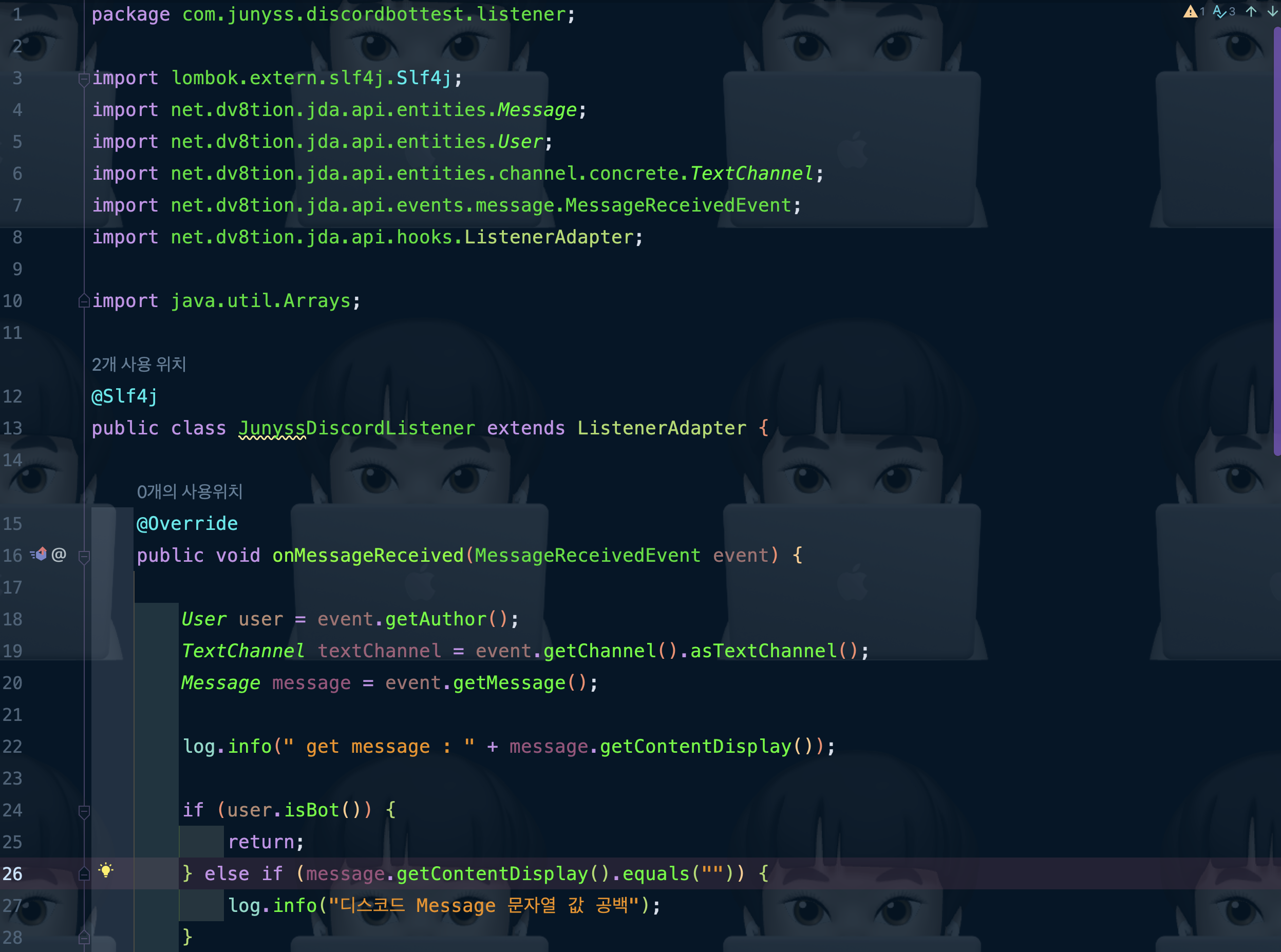 ์ด๋ฒ์๋ ์ค์ ๋ก ๋ฉ์์ง ์ฒ๋ฆฌ๋ฅผ ๋ด๋นํ DiscordListener๋ฅผ ๋ง๋ค์ด ์ฃผ์์ด์.