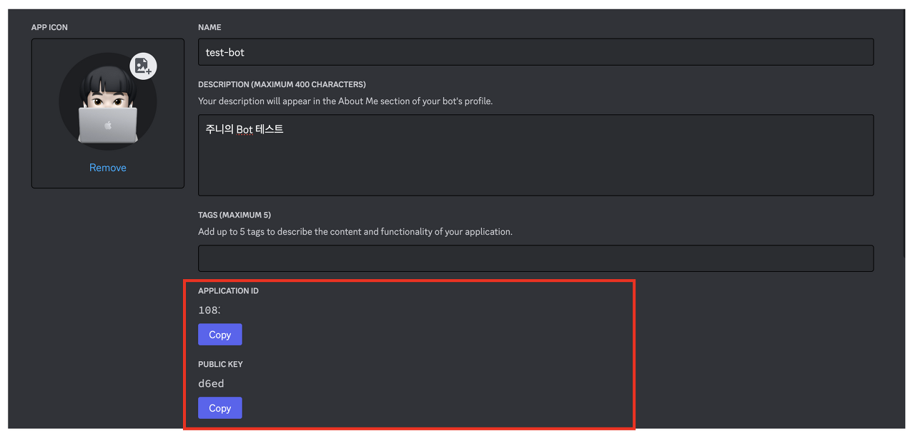 ๊ทธ๋ผ ์์ ๊ฐ์ด APPLICATION ID, PUBLIC KEY๊ฐ ๋ง๋ค์ด์ง ๊ฑธ ํ์ธํ ์ ์์ด์.