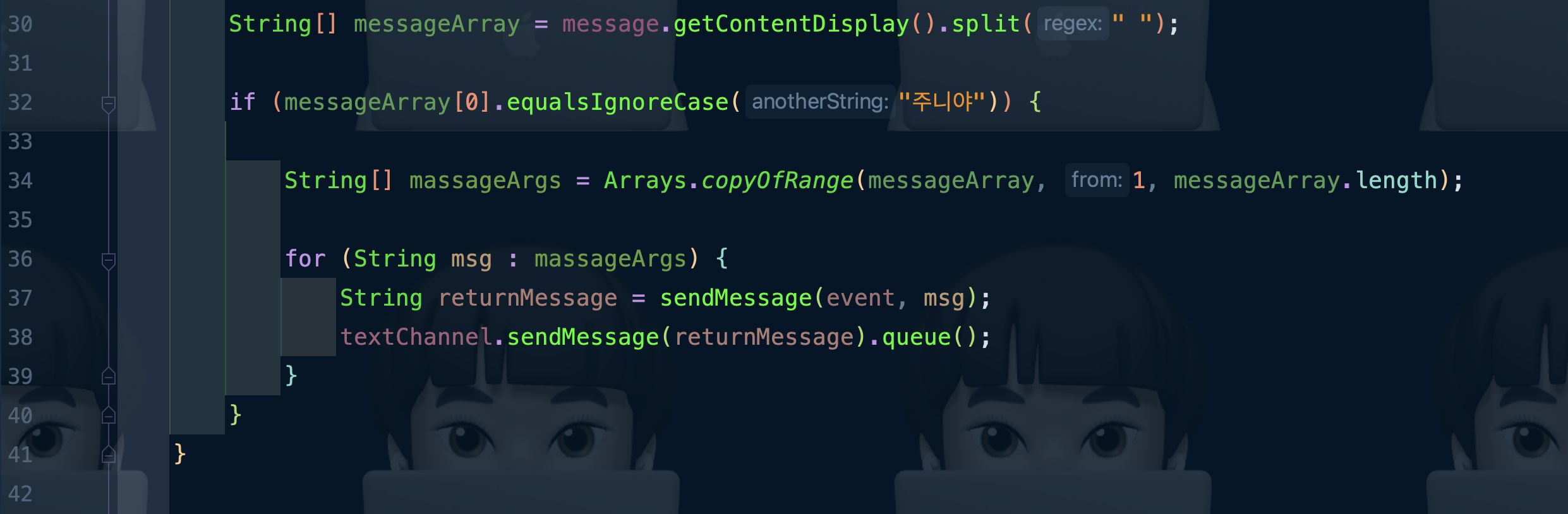 45๋ฒ์งธ ์ค์ event.getAuthor()๋ฅผ ํตํด ๋ฉ์์ง๋ฅผ ๋ณด๋ธ ์ฌ์ฉ์์ ์ ๋ณด๋ฅผ ๊ฐ์ ธ์ฌ ์ ์๋ ๊ฐ์ฒด๋ฅผ user ๋ณ์์ ๋ฃ์ด ์ฃผ์๊ณ , ๋ด์ด ๋ฐํํ ๋๋ต ๋ฌธ์์ด ๋ณ์ returnMessage๋ฅผ ๊ณต๋ฐฑ์ผ๋ก ์ด๊ธฐํ ํด ์ฃผ์์ด์.