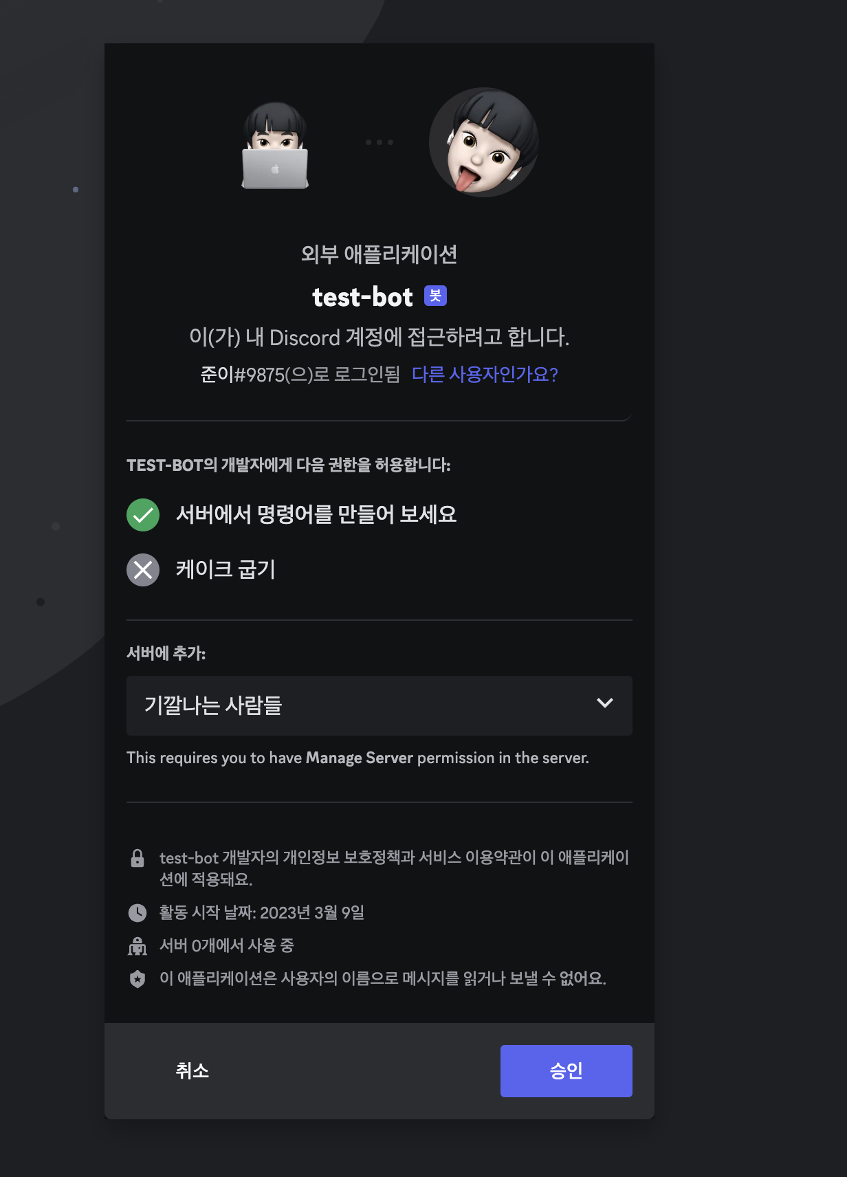 ์์ ๊ฐ์ด ์ถ๊ฐํ ๋์ค์ฝ๋ ์๋ฒ๋ฅผ ์ ํํ๊ณ , ์น์ธ์ ๋๋ฌ ์ค๋๋ค.