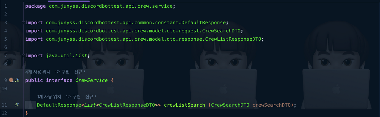 Interface๋ฅผ ๊ตฌํํ ๊ตฌํ์ฒด์์ ์ปจํธ๋กค๋ฌ๋ฅผ ํตํด ์ ๋ฌ๋ CrewSearchDTO๋ฅผ ๋ฐ์ ๋น์ฆ๋์ค ๋ก์ง์ ์ฒ๋ฆฌํ๊ฒ ํด ์ฃผ์์ด์.
