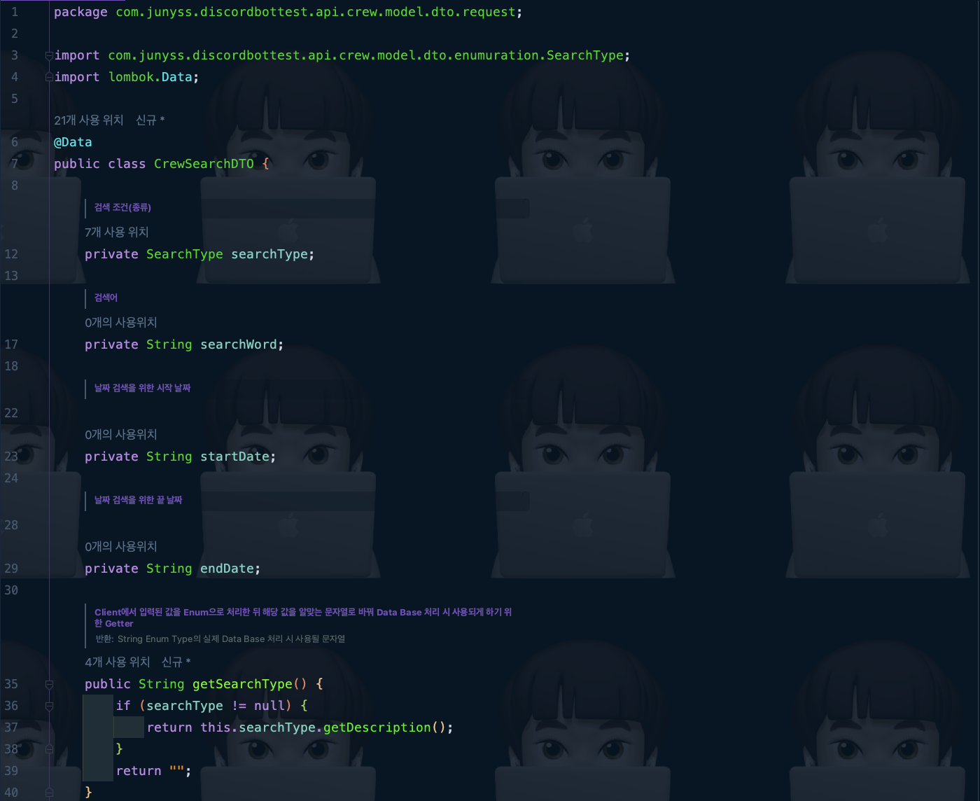 ๋ ฅ ํ์ ๋, ๊ทธ ๊ฐ์ด ๋ง์ด๋ฐํฐ์ค์์ ๊บผ๋ด ์ฌ์ฉํ ์ ์๋๋ก ๋ง๋ค์ด์ค Getter(๊ฒํฐ)์ธ๋ฐ, searchType ๋ณ์๊ฐ Enum Type(์ด๊ฑฐํ ํ์