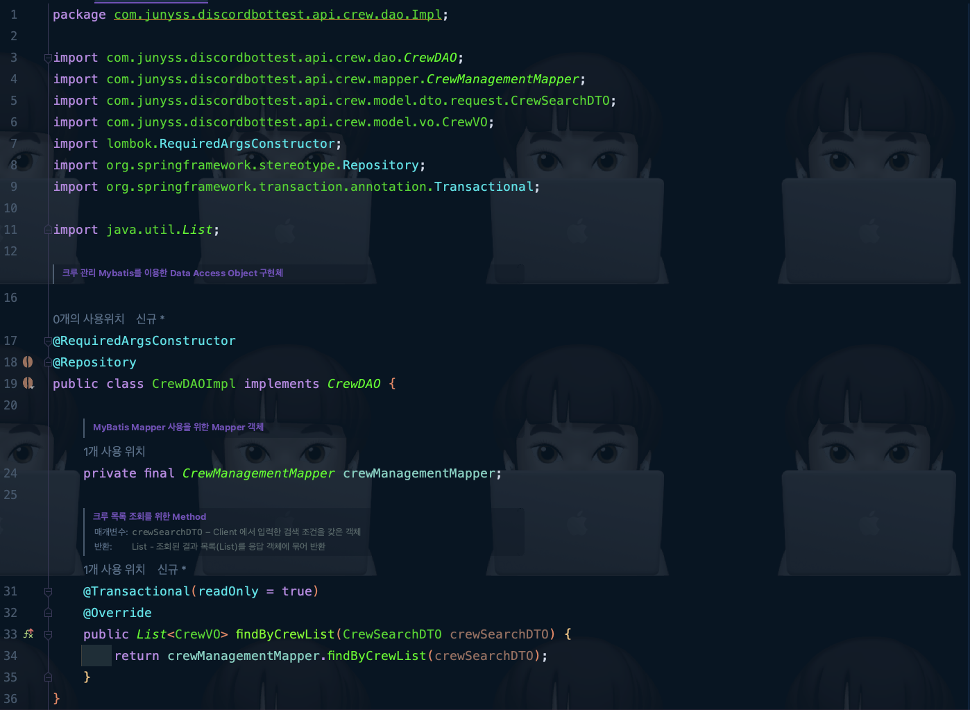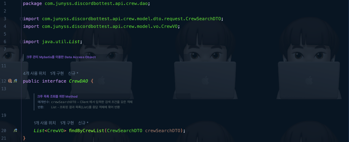 ๊ทธ๋ฐ ๋ค Mapper ๊ฐ์ฒด์ findByCrewList()๋ฅผ ํธ์ถํ์ฌ ์ญ์ DTO๋ฅผ ์ ๋ฌํด ์ฃผ์์ด์.