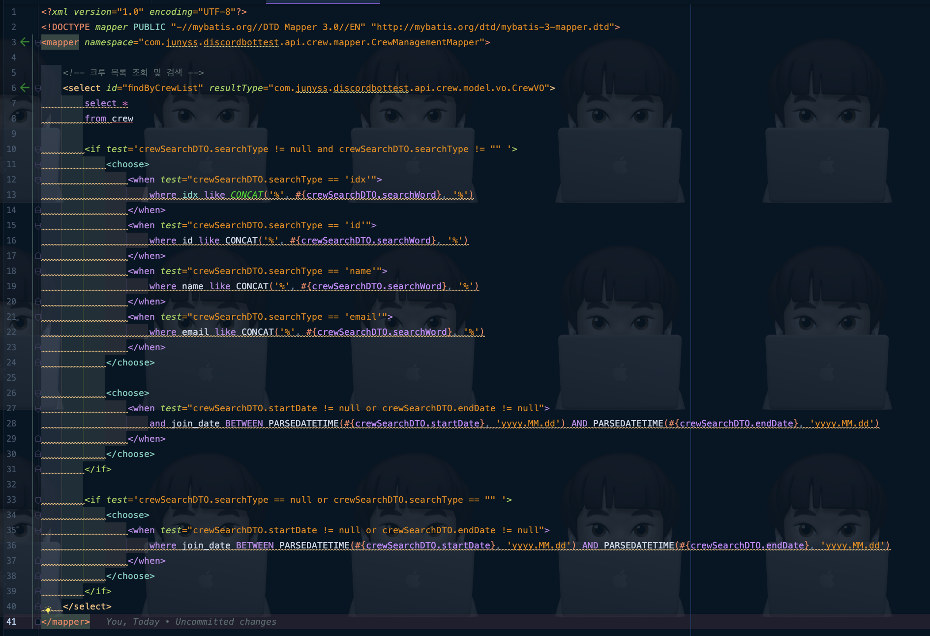์ด ๊ณณ์์ ์ค์ ๋ก ๋ง์ด๋ฐํฐ์ค์ SQL ๋ฌธ์ ์์ฑํ๋ XML์ ๋งคํํด ์ค ์ ์์ด์.