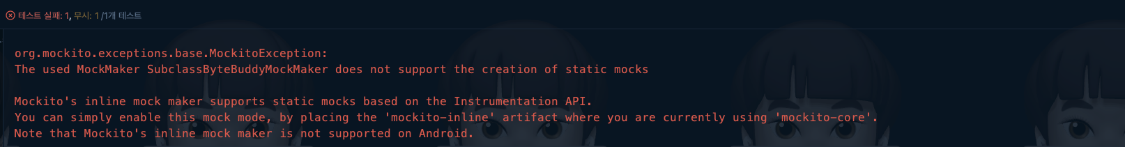 ์ด ๋ฌธ์ ๋ ํ์ํ ์์กด์ฑ์ ์ถ๊ฐํ์ง ์๊ณ , static Method๋ฅผ Mockingํ๋ ค๊ณ ํ๊ธฐ ๋๋ฌธ์ ๋ฐ์ํ ๋ฌธ์ ์์ด์.