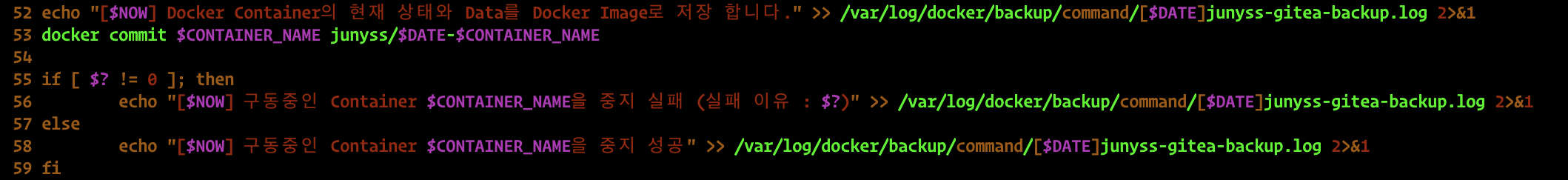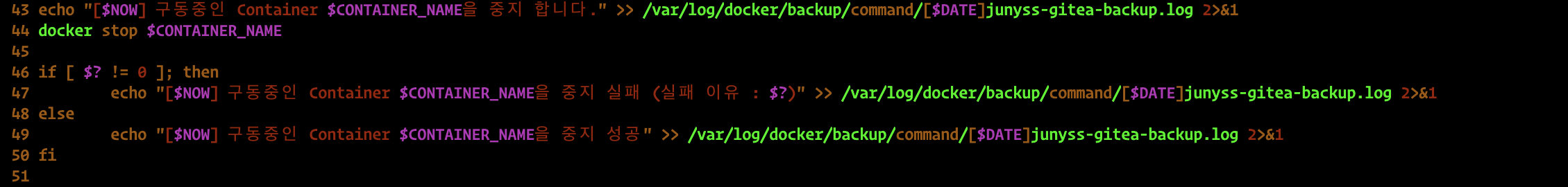 echo "[$NOW] ๊ตฌ๋์ค์ธ Container $CONTAINER_NAME์ ์ค์ง ์คํจ (์คํจ ์ด์ : $?)" >> /var/log/docker/backup/command/[$DATE]junyss-gitea-backup.log 2>&1