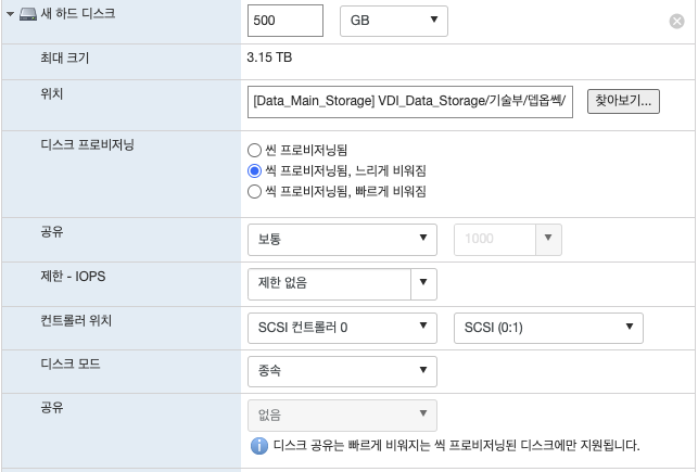 ๋ง์ฝ 500GB ์ฉ๋์ด ํ์ํ ์ํฉ์์ ๋น์ฅ ๊ทธ ์ฉ๋์ ํ ๋นํด์ค์ผ ํ๋ ๊ฒ์ด ์๋๋ผ๋ฉด Thin Provisioning์ ์ด์ฉํ์ฌ Disk ์ฉ๋์ ์์ํ ๋๋ ค๊ฐ๋ ๋ฐฉ์์ ์ด์ฉํ ์ ์์ด์. ๋ค๋ง, HDD๋ฅผ ์ฌ์ฉํ๋ค๊ณ ํ๋ฉด ๋ฏธ๋ฆฌ Disk ๊ณต๊ฐ๊ณผ ์ฃผ์๋ฅผ ํ๋ณดํ์ง ์๊ณ , ์ฐ๋ ๋ฐฉ์์ ์๋๊ฐ ๋๋ ค์ง ์ ์๋ ๋จ์ ์ ๊ฐ์ง๊ณ ์๋ต๋๋ค.