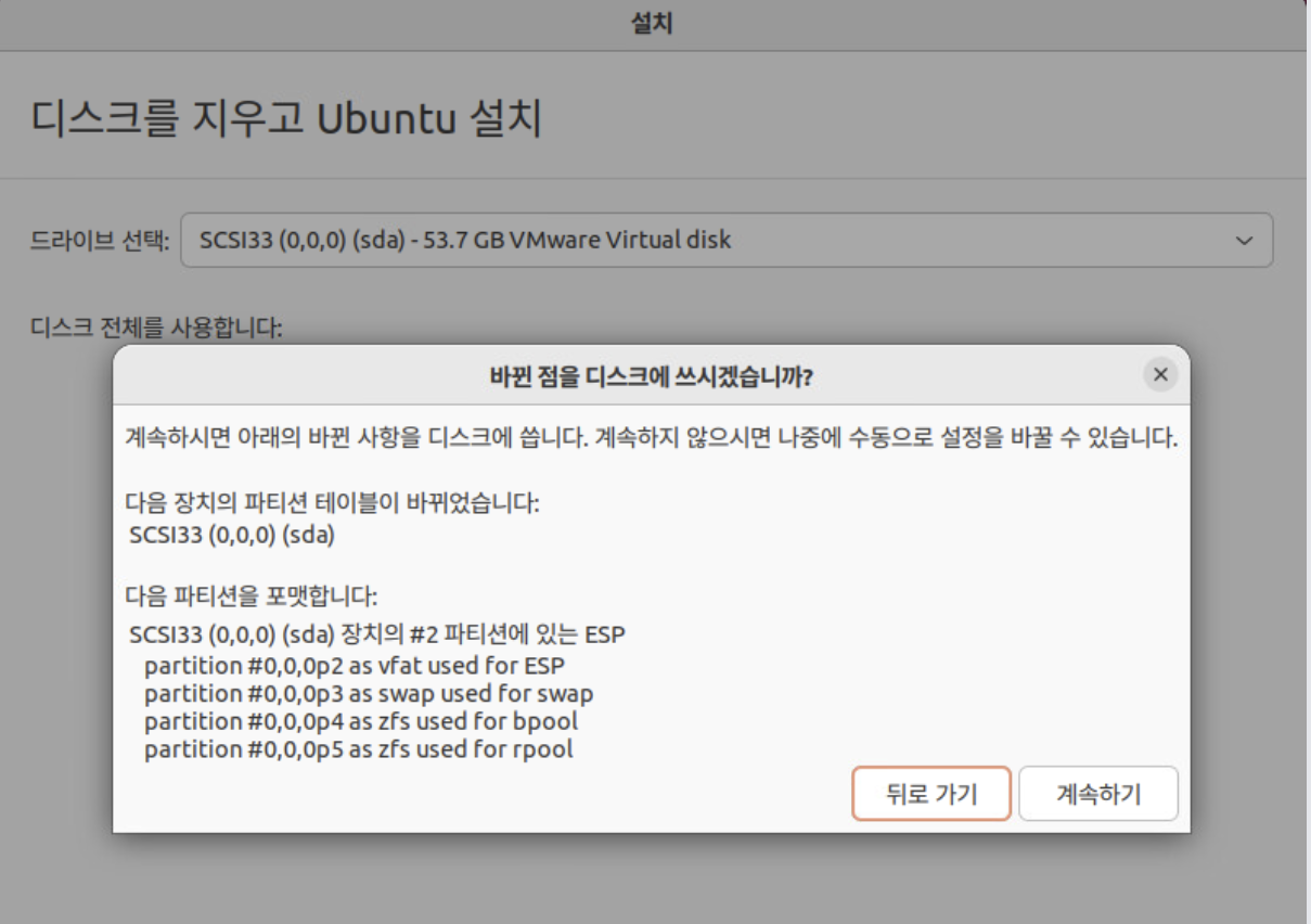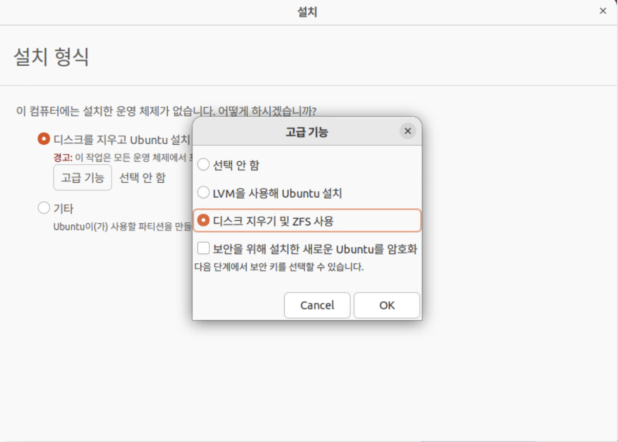 ์ฃผ๋์ฐ๋ ๋์คํฌ๋ฅผ ์ง์ฐ๊ณ Ubuntu๋ฅผ ์ ํํ๊ณ , ๊ณ ๊ธ ๊ธฐ๋ฅ์ ํด๋ฆญํ์ฌ ZFS ์ค์ ์ ํด ์ค๊ฑฐ์์.
