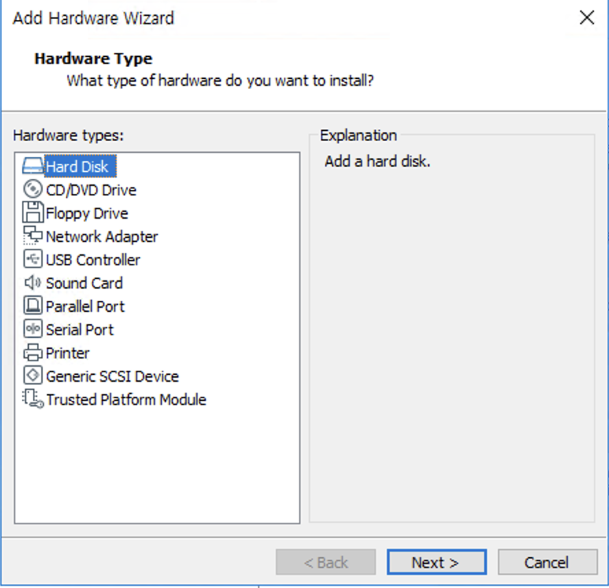 ์ฃผ๋๋ HDD๋ฅผ ์ถ๊ฐํ ๊ฒ์ด๊ธฐ ๋๋ฌธ์ Hard Disk๋ฅผ ์ ํํ๊ณ , Next๋ฅผ ๋๋ฌ์ค๊ฒ์.