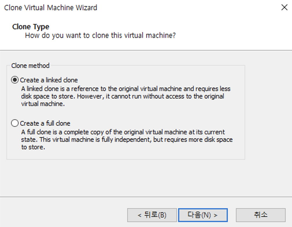 | Create a Full Clone | โ ์๋ณธ ๊ฐ์ ๋จธ์ ์ ๋ชจ๋ ํ์ผ์ ๋ณต์ฌํ๋ ๋ฐฉ์์ผ๋ก ์๋ณธ ๊ฐ์ ๋จธ์ ์ด ์ฌ์ฉํ๋ ๋งํผ์ ์ ์ฅ ๊ณต๊ฐ์ด ํ์ํ๋ค๋ ๋จ์ ์ด ์์ผ๋, ๋ณต์ ๋ฅผ ๋ง์น ๋ค ์๋ณธ๊ณผ ์๊ด์์ด ๋