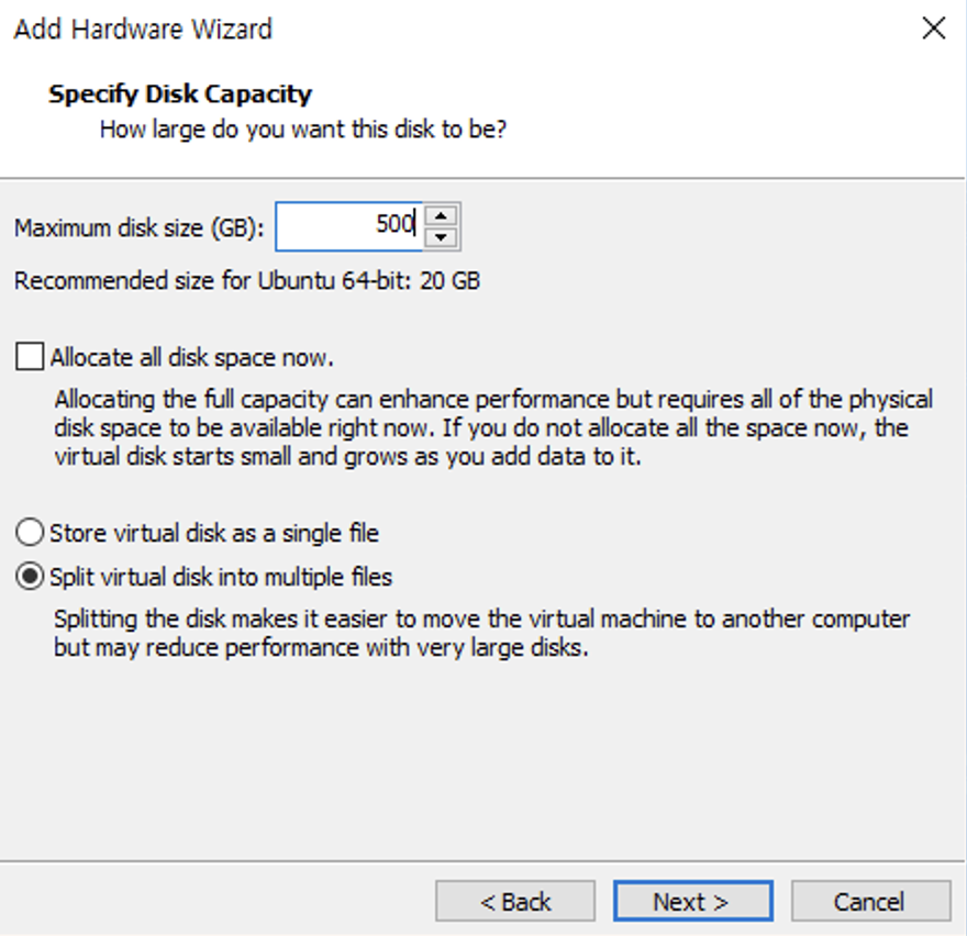 ์ด๋ Allocate all disk space now๋ฅผ ํ์ฑํ ํด ์ฃผ์๊ธฐ ๋๋ฌธ์ด์์.