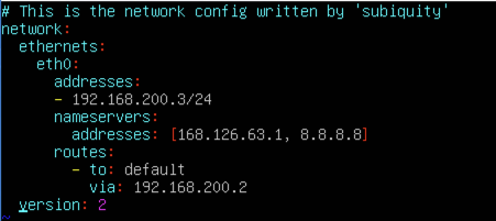 eth0 ๋ฐ์ addresses์๋ ํด๋น ์๋ฒ์ IP์ฃผ์์ CIDR์ ์์ฑํด ์ฃผ๊ณ , nameservers์ addresses์๋