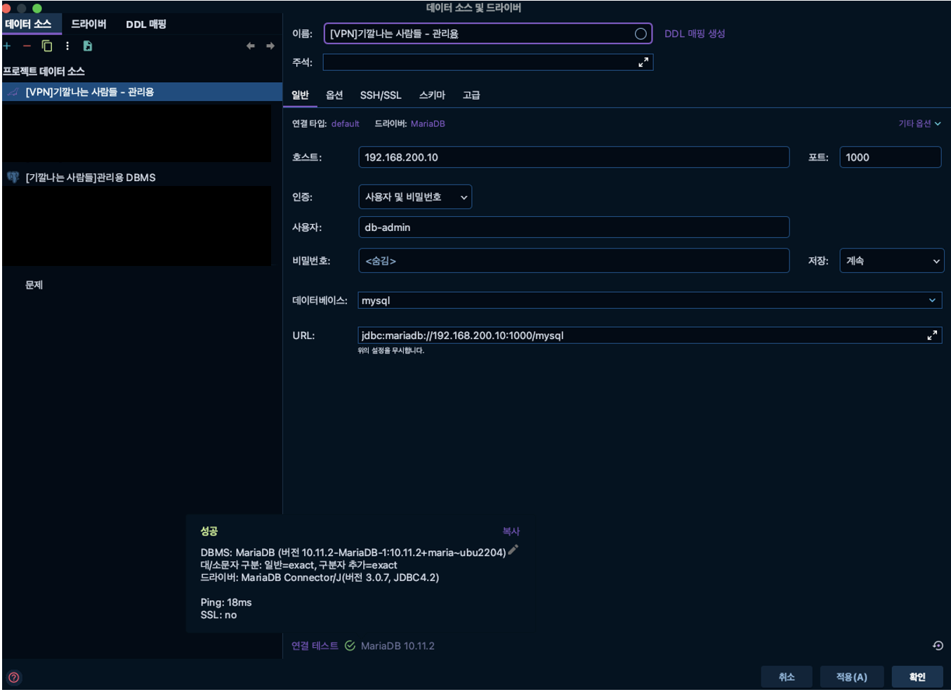 ์ด์ MariaDB์ ์ ์ํด์ ์ ์ ์ค์น ์ฌ๋ถ์ ์ธ๋ถ์์ ์ ์ํ ์ ์๋ ๊ณ์ ์ ๋ง๋ค๊ณ , DB Tool์ ์ด์ฉํด์ ์ ์ํด ๋ณผ๊ฒ์.