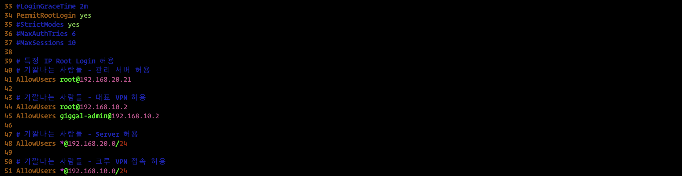 ์ด ๋, White List(ํ์ฉํ ๊ฒ๋ง ํ์ฉํ๊ณ , ๋๋จธ์ง๋ ์ฐจ๋จ) ๋ฐฉ์์ธ AllowUsers๋ก๋ง ์ ์ฑ