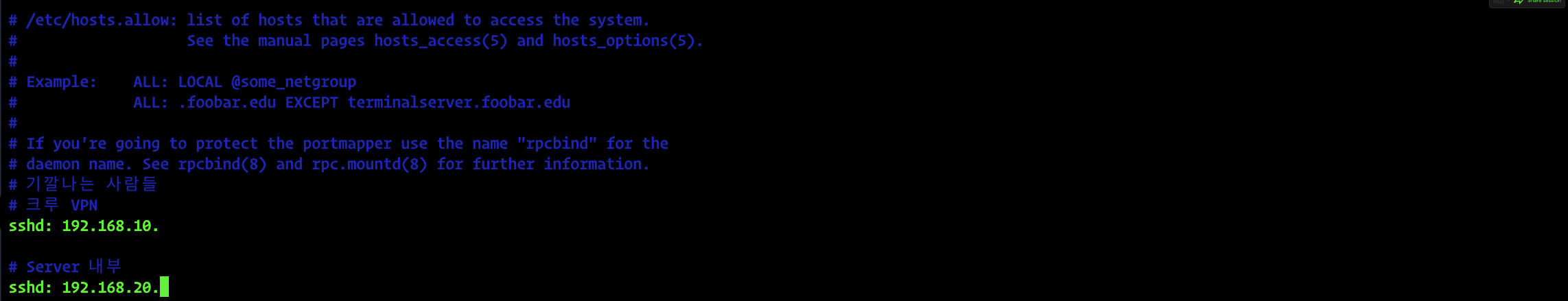 โ /etc/hosts.allow์ ์ ์ฑ ์ ์ถ๊ฐํ๋ฉด ํ์ฉ ์ ์ฑ