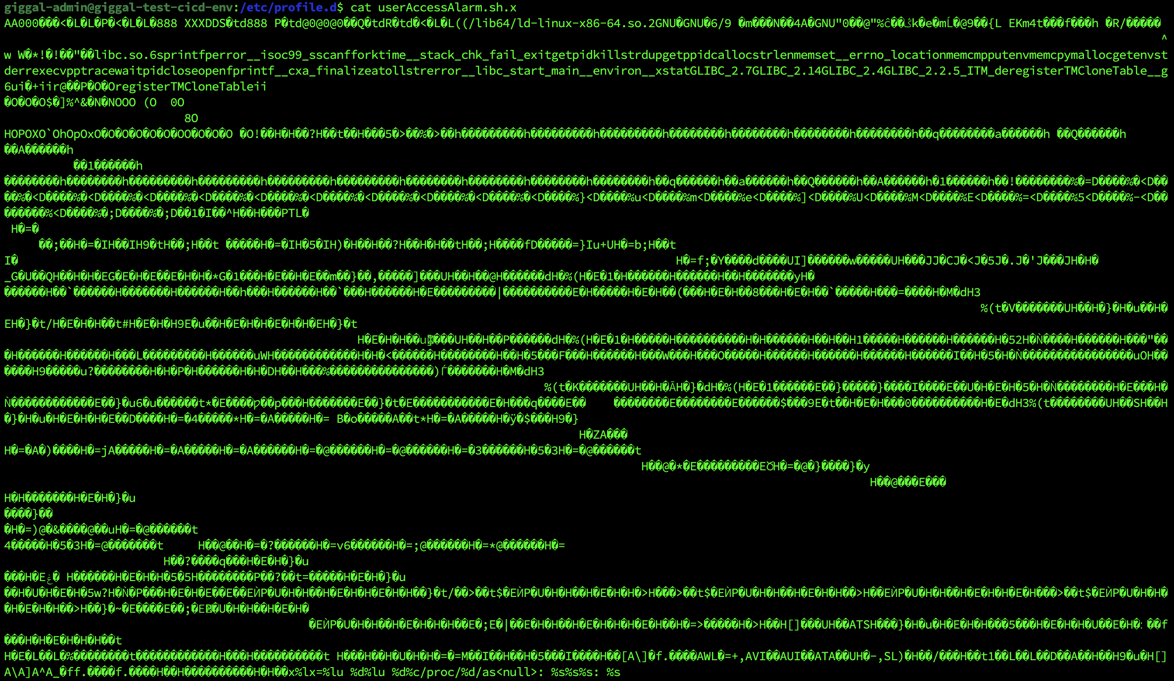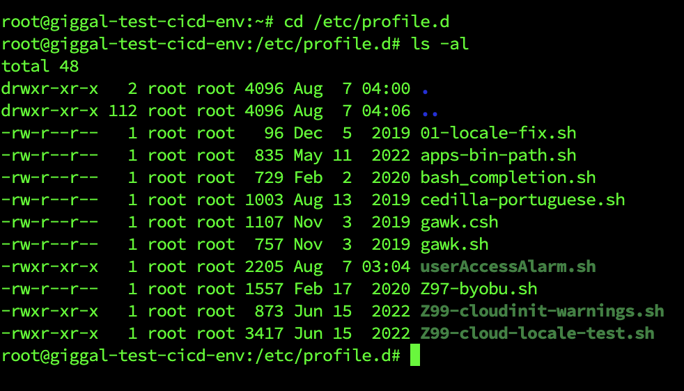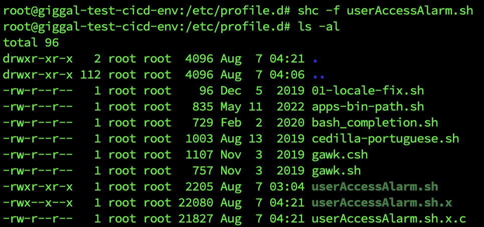 root ๊ณ์ ์ผ๋ก ์ค์์นญํ ๋ค /etc/profile.d ๋ฐ์ ์๋ UserAccessAlarm.sh๋ฅผ ์ํธํ ํด๋ณด๋๋ก ํ ๊ฒ์.