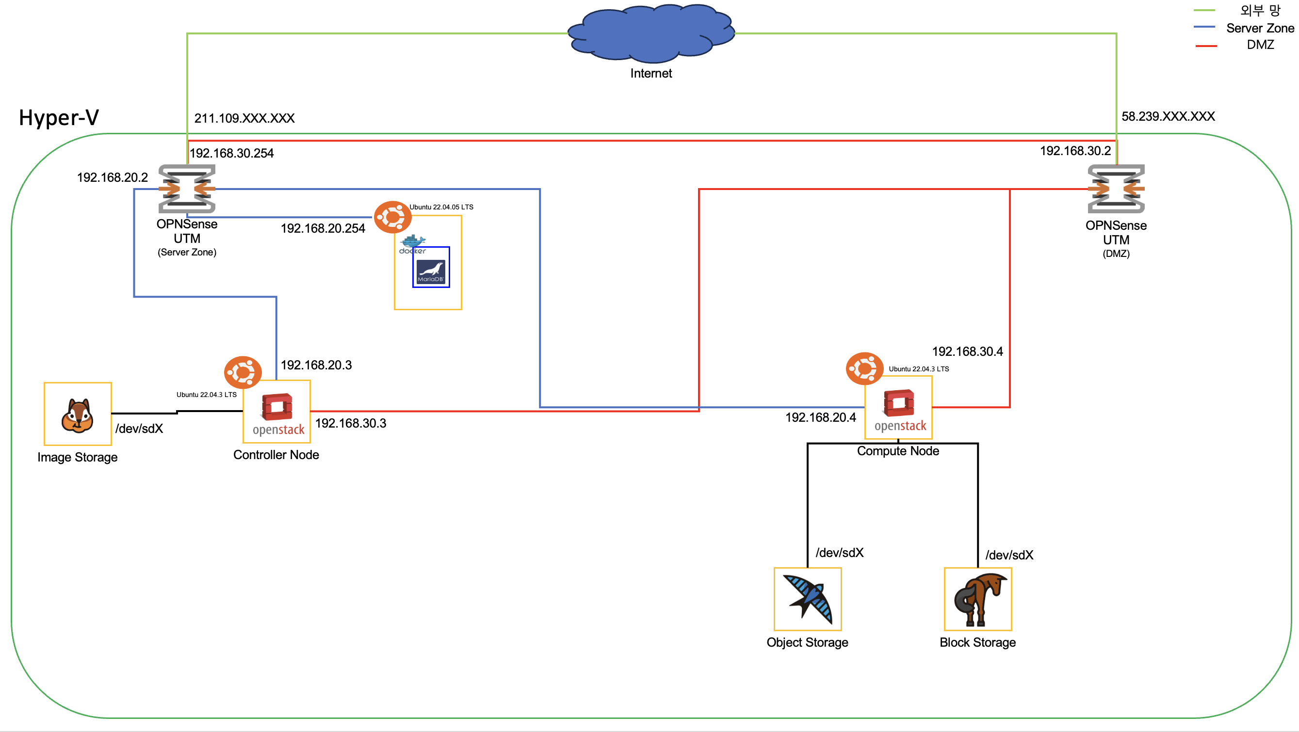์ฃผ๋์ ์๋ฒ๋ ๋ ๊ฐ์ Lan Port๊ฐ ์์ด ๊ฐ๊ฐ ์ธ๋ถ๋ง์ผ๋ก ์ฐ๊ฒฐํด ์ฃผ์๊ณ , ๋ด๋ถ์ OPNSense๋ฅผ ์ด์ฉํ์ฌ ๋ฐฉํ๋ฒฝ, VPN, IPS, WAF ๋ฑ์ ๊ตฌ์ฑํด ์ฃผ์์ด์.