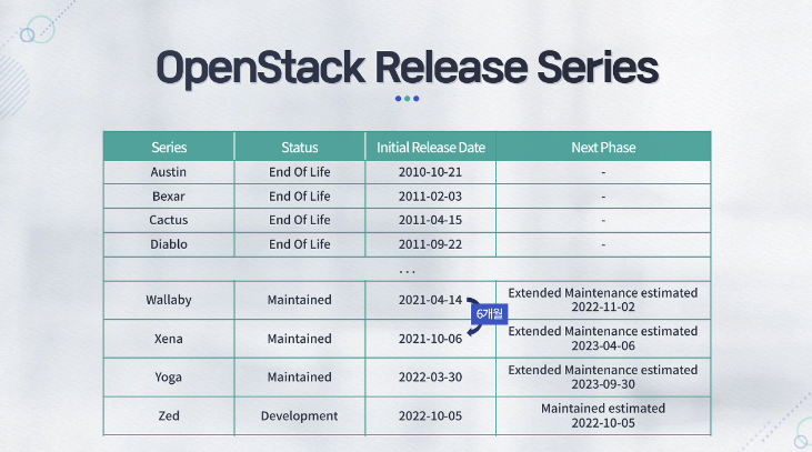 ์๋ก์ด ๋ฒ์ ์ด ๋ฆด๋ฆฌ์ฆ๋๋ฉฐ, ์ธ์ฆ์ ๋ด๋นํ๋ Keystone, Cinder, Horizon ๋ฑ์ ๋ถ๊ฐ ์๋น์ค ํ๋ก์ ํธ๊ฐ ์ค๋น ๋์ด ์๊ณ , Kilo ๋ฒ์ ๋ถํฐ๋ ์๋ก์ด ๊ธฐ๋ฅ ์ถ๊ฐ๋ณด๋ค ์์ ์ฑ ๋ฐ ์ฑ๋ฅ ๊ฐ์ ์ ์ฃผ๋ ฅํ๊ณ ์๋ค๊ณ ํด์.