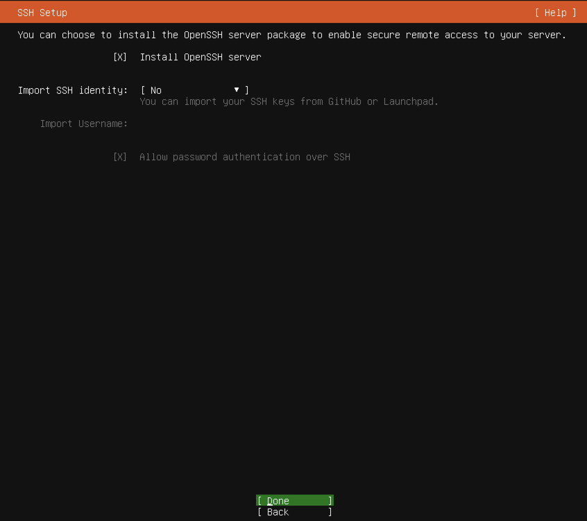 SSH๋ก ์ ์ํ์ฌ ๊ด๋ฆฌํ๊ณ ์ถ๋ค๋ฉด ์์ ๊ฐ์ด Install OpenSSH server๋ฅผ ํ์ฑํํ๊ณ , Done์ ์ ํํ๊ณ ,
