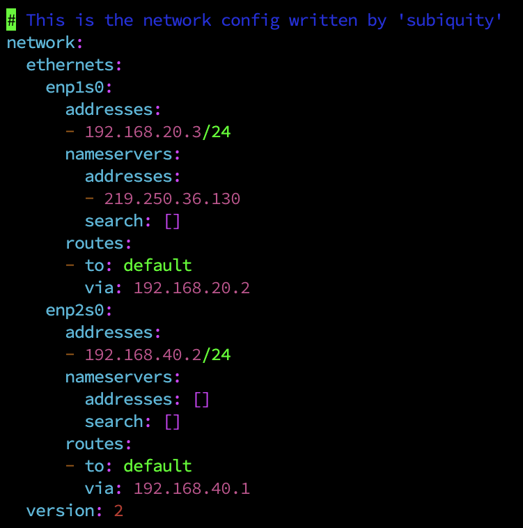 ์ฃผ๋๋ ์์ ๊ฐ์ด ๋ด๋ถ ๋ฒ๋ง ์ฐ๊ฒฐ์ ์ํ NIC enp1s0์ ์คํ ์คํ ํต์ ์ ์ํ enp2s0๋ฅผ ์์ ๊ฐ์ด ์ค์ ํด ์ฃผ์์ด์.