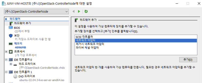 NIC๊ฐ ํ๋ ๋ ํ์ํ๊ธฐ ๋๋ฌธ์ ์์ ๊ฐ์ด ๋คํธ์ํฌ ์ด๋ํฐ๋ฅผ ์ถ๊ฐํด ์ค๊ฒ์.