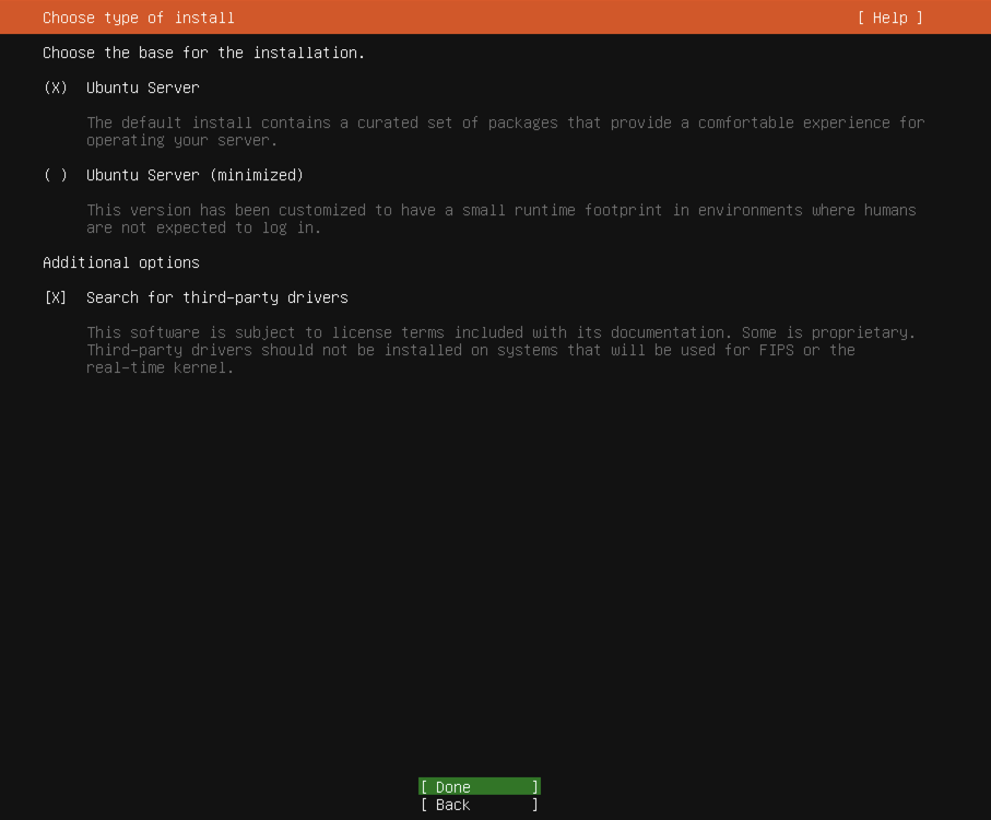 ํ์ํ Default Package๋ค๊ณผ third-party driver๊ฐ ์ค์น๋๊ฒ ํ์ฑํ ํ ๋ค Done์ ์ ํํ์ฌ Enter๋ฅผ ๋๋ฌ์ค๊ฒ์.