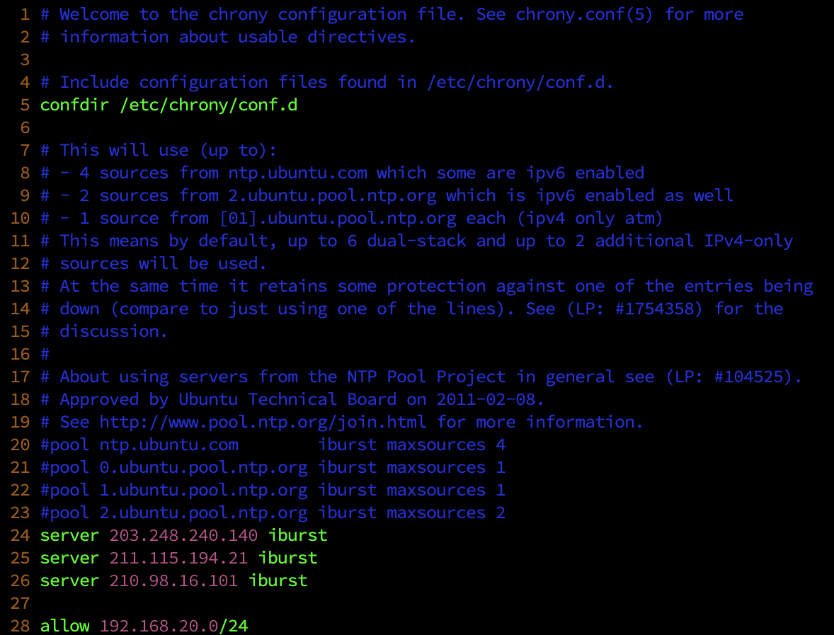 ์์ ๊ฐ์ด ์ค์นํ ๋ค /etc/chrony/chrony.conf File(ํ์ผ)์ ํธ์งํ์ฌ ํด๋น Key(ํค)๋ฅผ ๋์ ํ๊ฒฝ์ ๋ง๊ฒ ํ์์ ๋ฐ๋ผ