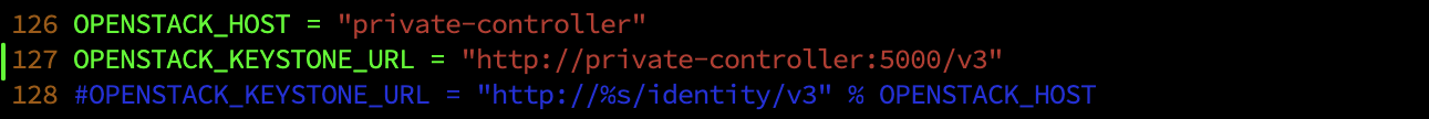 root@dlp ~(keystone)# vi /etc/openstack-dashboard/local_settings.py # line 99 : change Memcache server CACHES = { 'default': { 'BACKEND': 'django.core.cache.backends.memcached.MemcachedCache', 'LOCATION': '10.0.0.30:11211', }, } # line 113 : add SESSION_EN
