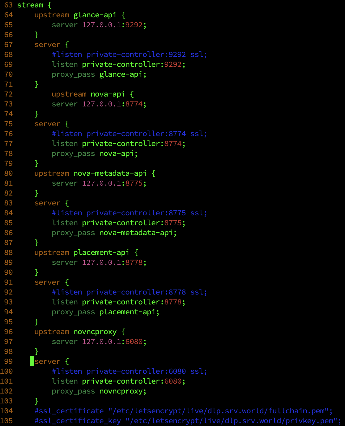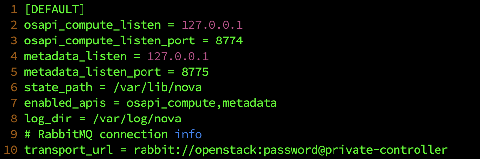 root@dlp ~(keystone)# mv /etc/nova/nova.conf /etc/nova/nova.conf.org root@dlp ~(keystone)# # create new [DEFAULT] osapi_compute_listen = 127.0.0.1 osapi_compute_listen_port = 8774 metadata_listen = 127.0.0.1 metadata_listen_port = 8775 state_path = /var/li