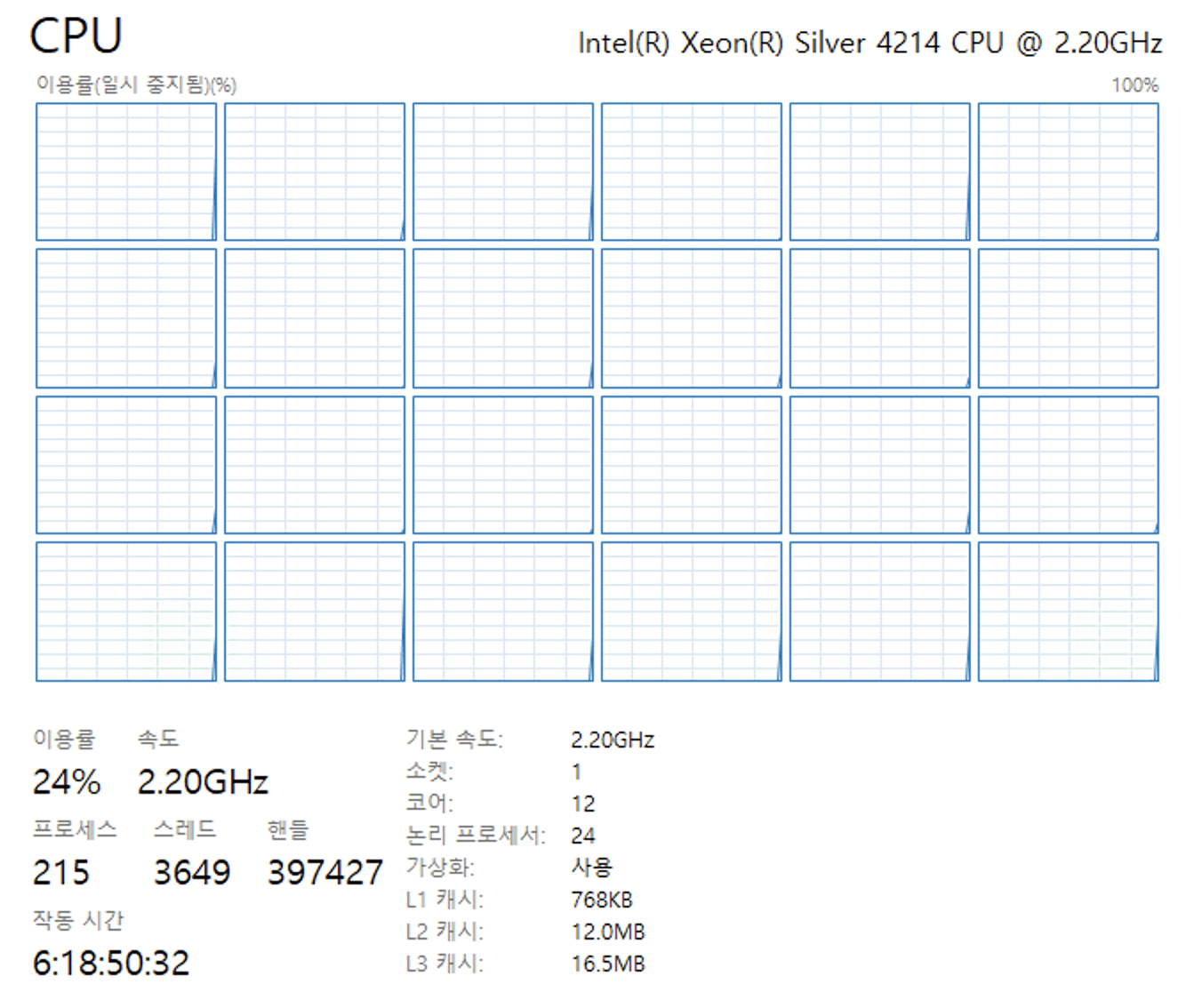 12์ฝ์ด์ 24 ์ค๋ ๋๋ฅผ ๋ณด์ ํ๊ณ ์๋ Xeon Silver 4214 CPU๋ฅผ ์ฌ์ฉํ๊ณ ์์ด์.