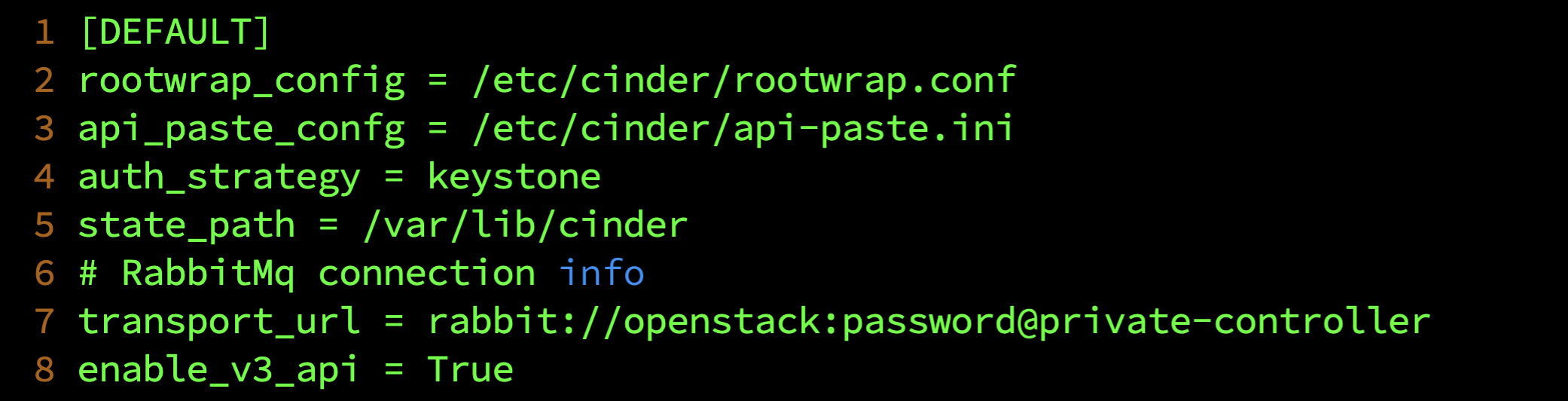 23๋ฒ์งธ ์ค์ servicepassword์๋ ์์์ cinder ๊ณ์ ์ keystone์ ๋ฑ๋กํ ๋, ์ฌ์ฉํ๋ ์ํธ๋ฅผ ์