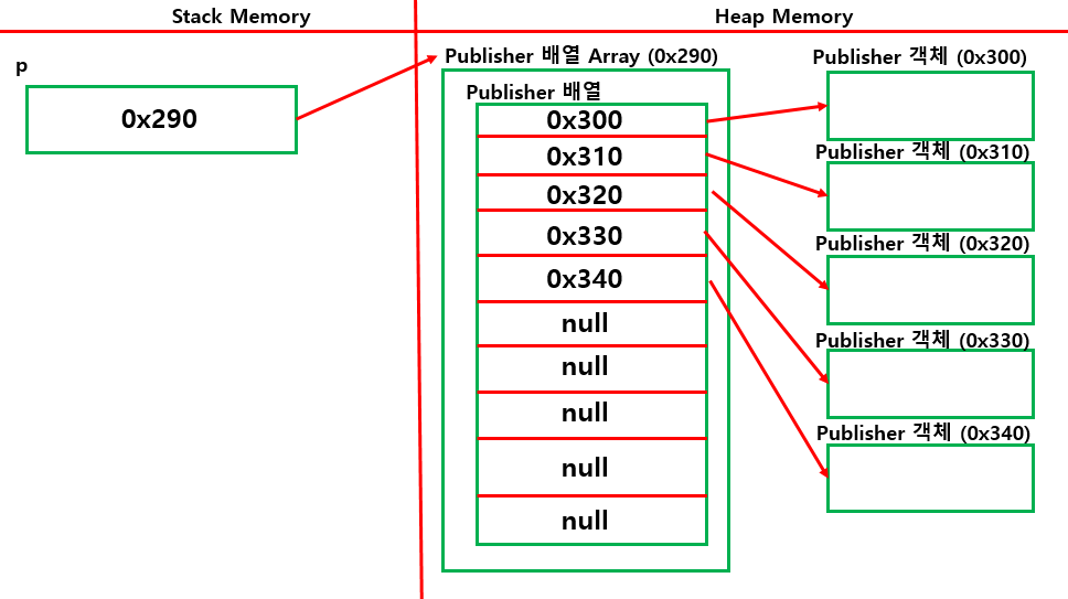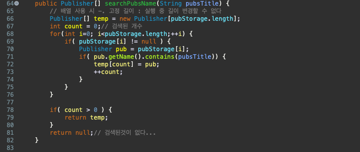 66๋ฒ ์ค์ ๋ณด๋ ๋ ๋ค๋ฅธ ์ฐธ์กฐํ ๋ฐฐ์ด์ ๋ง๋ค์ด ์ฃผ๊ณ ์๋ค์. Publisher ๋ฐฐ์ดํ ์ฐธ์กฐ ๋ณ์ temp์ publisher์ด๋ผ๋ ๋ฐฐ์ด์ ์์ฑํ๋๋ฐ, ๊ทธ ๋ฐฐ์ด์ ๊ธธ์ด๋ pubStorage๋งํผ ์ ๋๋ค.