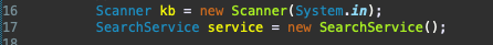 SearchService Type์ service ๋ณ์์ SerchService(); ๊ฐ์ฒด๋ฅผ ์์ฑํ์ฌ ๋ฃ์ต๋๋ค.