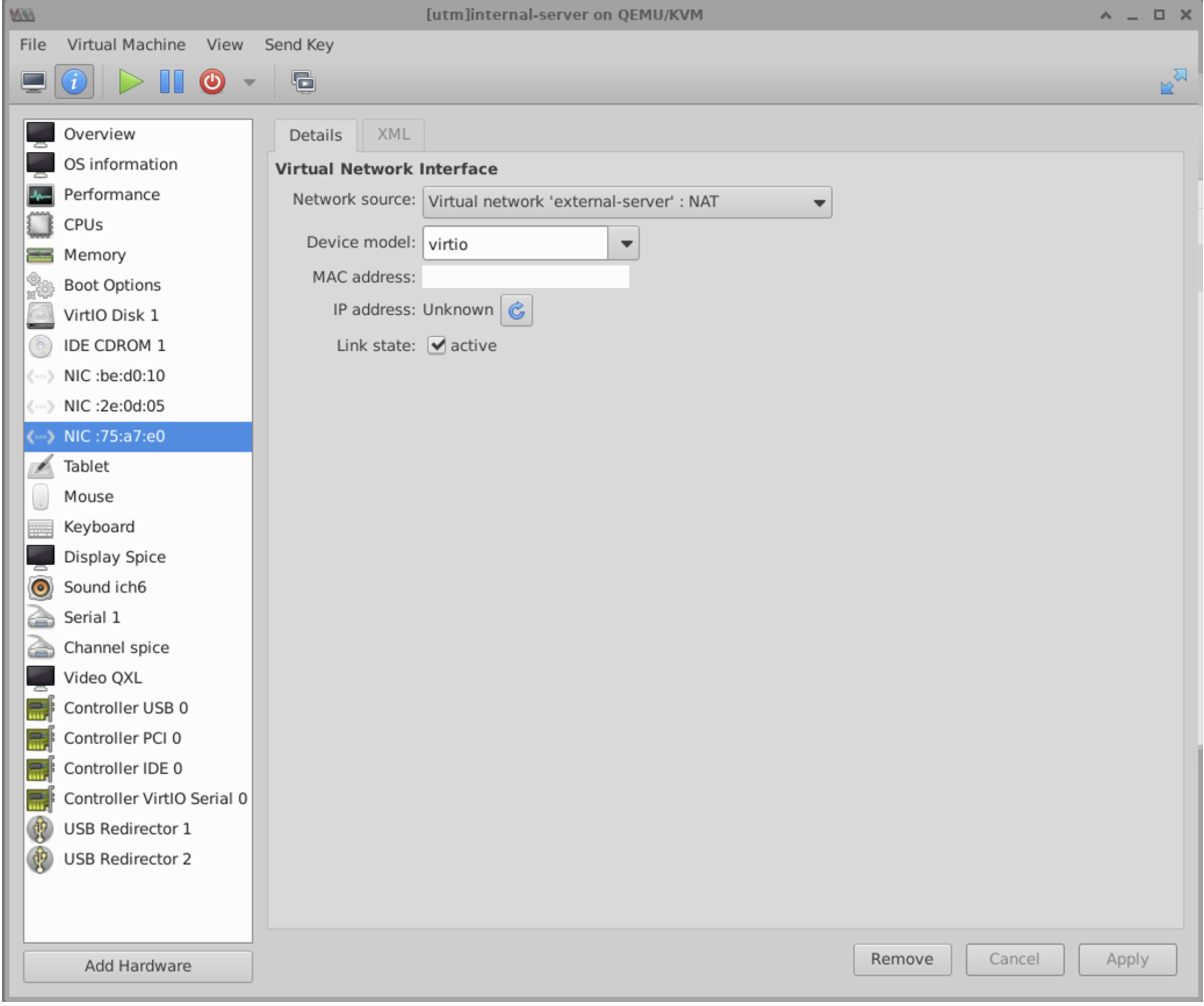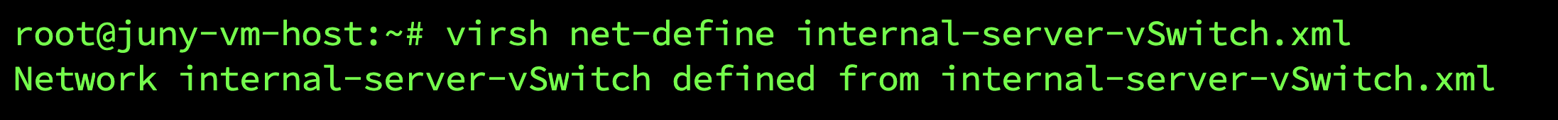 ์ต์ด libvirt ๋คํธ์ํฌ ์ค์ ์ ํด ์ค๊ฑด๋ฐ, libvirt๋ฅผ ์ฌ์ฉํ์ฌ ๊ฐ์ ๋คํธ์ํฌ๋ฅผ ์์ฑํ๊ณ , ๊ตฌ์ฑํด ๋ณผ๊ฑฐ์์. ์ฃผ๋๋ internal-server-vSwitch๋ผ๋ ๊ฐ์ ๋คํธ์ํฌ๋ฅผ ๋ง๋ค์ด ์ค๊ฑฐ์์.