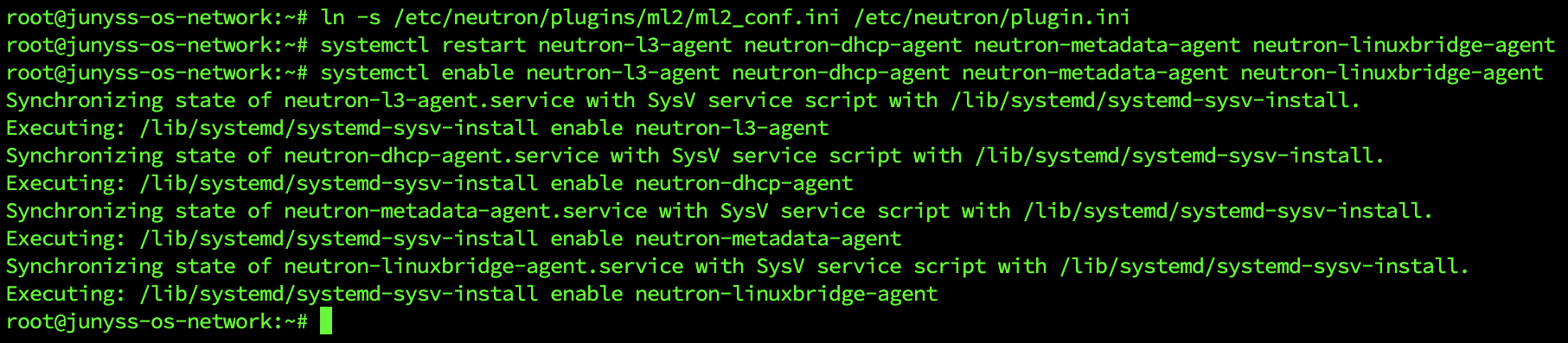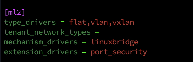 root@network:~# mv /etc/neutron/neutron.conf /etc/neutron/neutron.conf.org root@network:~# vi /etc/neutron/neutron.conf # create new [DEFAULT] core_plugin = ml2 service_plugins = router auth_strategy = keystone state_path = /var/lib/neutron allow_overlappi