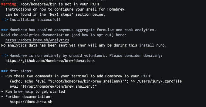 ์์ ๊ฐ์ด Warning: /opt/homebrew/bin is not in your Path๋ผ๋ ๋ฌธ์ ๊ฐ ๋ฐ์ํ๊ฑธ ์ ์ ์์ด์.