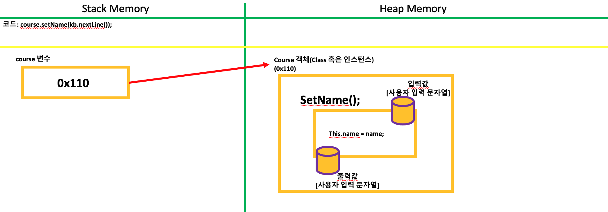 ๊ทธ ๋ค์ course ๋ณ์๊ฐ ๊ฐ๋ฅดํค๊ณ ์๋ Course ๊ฐ์ฒด์ setName Method(Setter)๋ฅผ ํธ์ถํ๋๋ฐ, ์ ๋ ฅ๊ฐ์ผ๋ก ์ฌ์ฉ์๊ฐ ์ ๋ ฅํ ๊ฒ์์ด๋ฅผ ์ ๋ฌํ๊ณ ์๋ ๊ฒ์ด์์. SetName์ผ๋ก ๋ค์ ๊ฐ๋ด์ผ๊ฒ ์ด์!