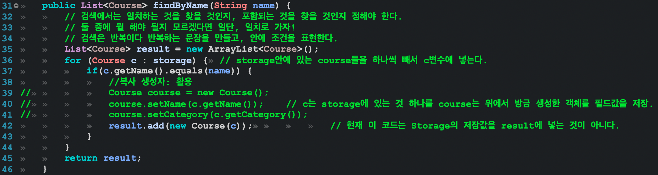 storage ํ๋๊ฐ ๊ฐ๋ฅดํค๋ ๊ณณ์ ๋ฐ๋ก List<Course>์๋ ๊ฒ์ด์์. Course๋ฅผ ์๋ฃํ์ผ๋ก ํ๋ List๋ผ๋ ๋ป์ด๊ณ , ์ด๊ฒ ์ญ์ private์ด๋ค์.