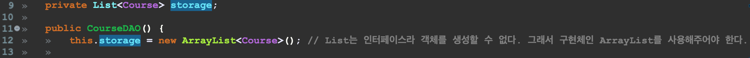 ๊ทธ๋ฆฌ๊ณ , 11๋ฒ์งธ ์ค์ ๋ณด๋ฉด CourseDAO ๊ฐ์ฒด์ ๊ธฐ๋ณธ ์์ฑ์๊ฐ ์๋๋ฐ, ์ฌ๊ธฐ์ storage ํ๋์ ์๋ฃํ ํ์ ์ด Course์ธ ArrayList๋ฅผ ์์ฑํด์ ๋ฃ์ด์ฃผ๊ณ ์๋ ๊ฒ์ด์์. add๋ผ๋ Method๋ ์ด๋ฏธ ์๋ฐ์์ ์ ๊ณตํ๋ API๋๋๋ค. ๋ฐ๋ก ์ ์ธ ํด ์ฃผ๋ ๊ฒ์ด ์๋์์. List๋ฅผ ๋ง๋ค๋ฉด
