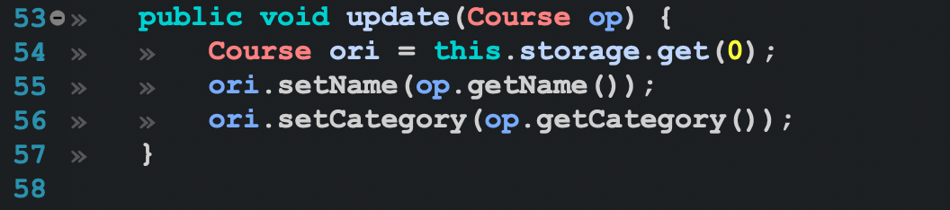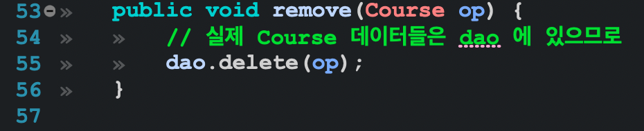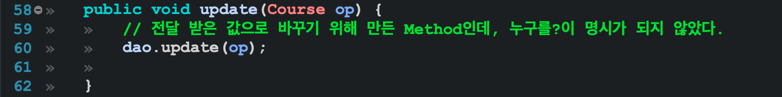 update Method๋ ์ ๋ ฅ๊ฐ์ผ๋ก Course ์๋ฃํ ํ์ op๋ฅผ ์ ๋ ฅ ๋ฐ๊ณ , ๊ทธ๊ฒ์ dao ๋ณ์๊ฐ ๊ฐ๋ฅดํค๋ CouseDAO ๊ฐ์ฒด์ update Method๋ฅผ ํธ์ถํ๋๋ฐ, ์ ๋ ฅ๊ฐ์ผ๋ก op๋ณ์๋ฅผ ์ ๋ฌํ๊ณ ์๋ ๊ฒ์ด์์. update Method๋ฅผ ๋ง๋๋ฌ ๊ฐ๋ด์ผ ๊ฒ ์ด์!