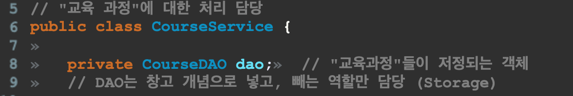 private CourseDAO dao; // "๊ต์ก๊ณผ์ "๋ค์ด ์ ์ ๋๋ ๊ฐ์ฒด