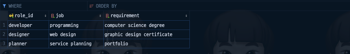 await queryRunner.query(`CREATE TABLE "role" ("role_id" varchar(255) PRIMARY KEY NOT NULL, "job" varchar(255) NOT NULL, "requirement" varchar NOT NULL, CONSTRAINT "UQ_df46160e6aa79943b83c81e496e" UNIQUE ("role_id"))`);