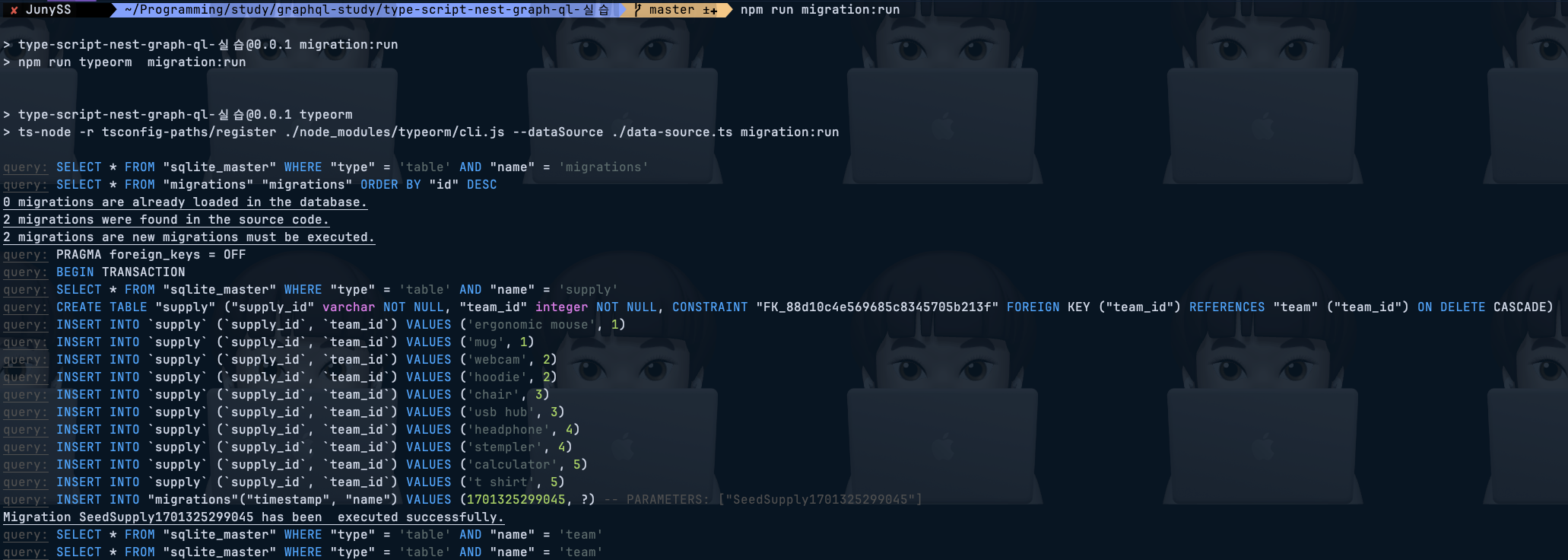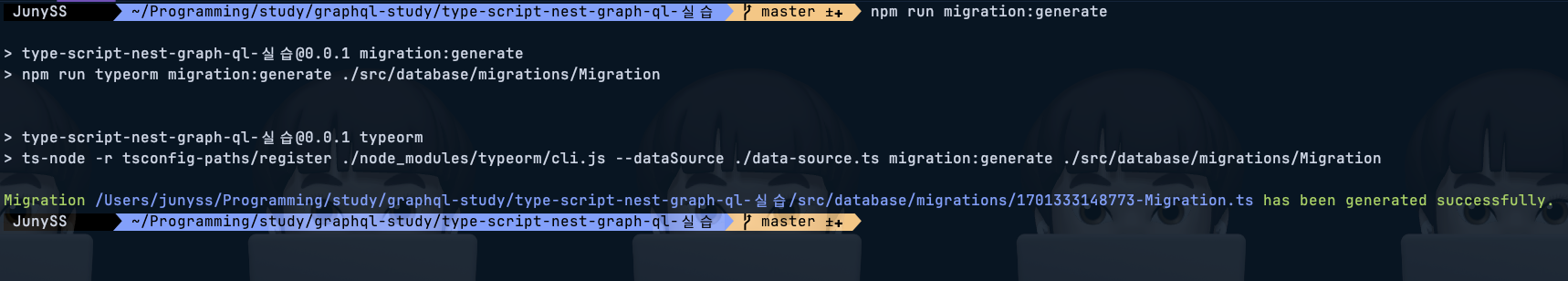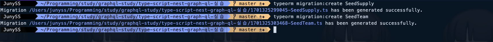 โ JunySS ๐ฐ ๎ฐ ~/Programming/study/graphql-study/type-script-nest-graph-ql-์ค์ต ๎ฐ ๎ master ±โ ๎ฐ npm run migration:run