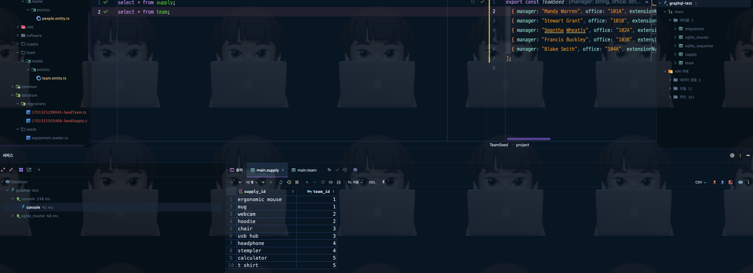 ์ด ๊ธ์ Nest.JS๋ฅผ ์ด์ฉํด GraphQL ์ค์ต ํ๊ฒฝ ๊ตฌ์ฑ ์ค Mock Data๋ฅผ ๊ตฌ์ฑํ๊ธฐ ์ํด TypeORM Extension์ Seeding์ ํ๋ฉด์ ๋ฐ์ํ ๋ฌธ์ ์ ๋ํด ์ ๋ฆฌํ๋ ๊ธ์ด์์.