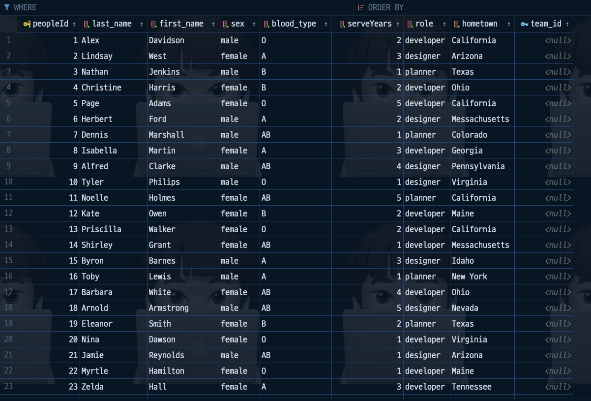 await queryRunner.query(`CREATE TABLE "people" ("people_id" integer PRIMARY KEY AUTOINCREMENT NOT NULL, "last_name" varchar(255) NOT NULL, "first_name" varchar(255) NOT NULL, "sex" varchar(6) NOT NULL, "blood_type" varchar(2) NOT NULL, "serveYears" integer NOT NULL, "role" varchar(100) NOT NULL, "hometown" varchar NOT NULL, "team_id" integer, CONSTRAINT "UQ_017abdefead91b361b5e7ac108f" UNIQUE ("people_id"))`);